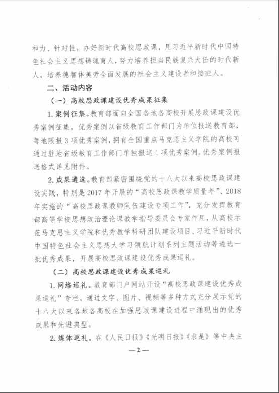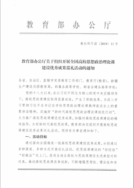 现将教育部办公厅关于组织开展全国高校思想政治理论课建设优秀成果巡礼活动的通知》(教社科厅函〔201911号)转发给你们,贯彻落实提出要求如下