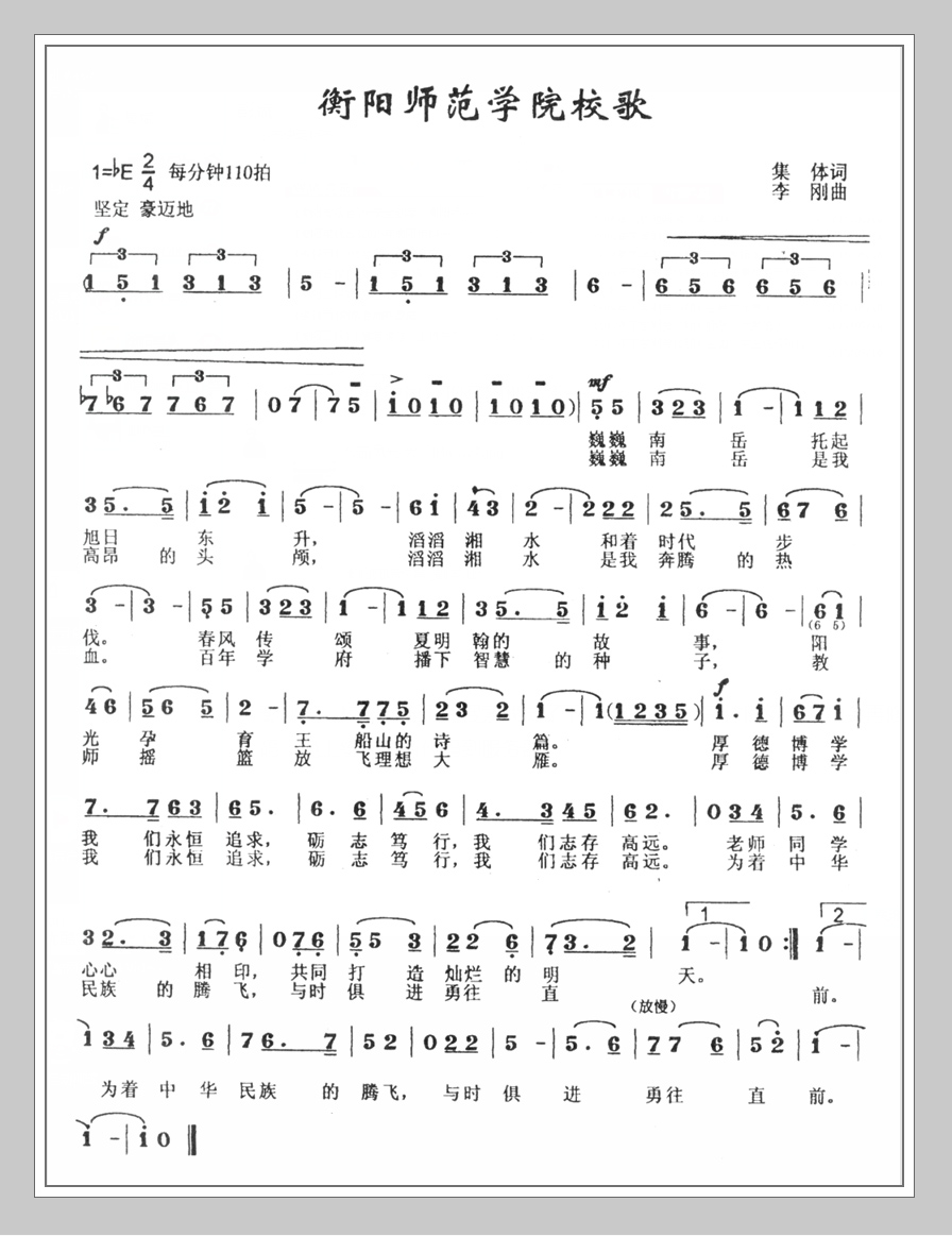 校歌歌曲为进行曲风格。全曲音乐分为两个部分。在激昂的前奏之后,第一部分热情而舒展,八度等大跳音程的运用,表现了南岳的雄伟和sjb官网师生良好的精神风貌;第二部分坚定有力的附点及切分节奏的运用讴歌了“校训”的精神,表现了师生面向美好未来的坚强决心。全曲昂扬向上,刚柔相济,旨在激励师生立志奋发,开创未来。