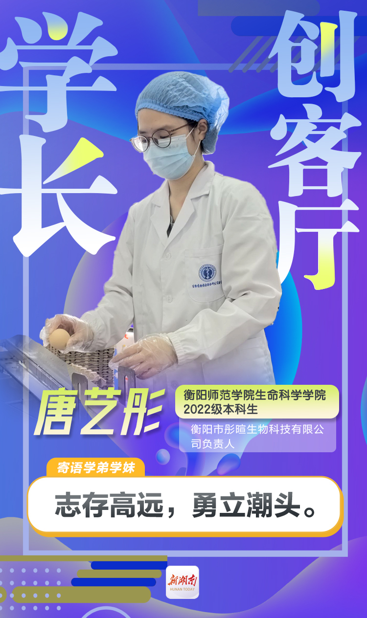 2024年,唐艺彤与4名同学创立了衡阳市彤暄生物科技有限公司。目前,公司已成功研发4款宠物抗体制剂产品,并与部分企业签订了价值120万元的意向订单,团队在研发过程中申请了17项专利,其中学生专利4项。项目累计投入研发经费超600万元,建立了基因工程、疫苗工程等多领域技术体系,配备3000万元先进设备,并获国家级一流专业建设点及湖南省相关产学研中心技术支持。